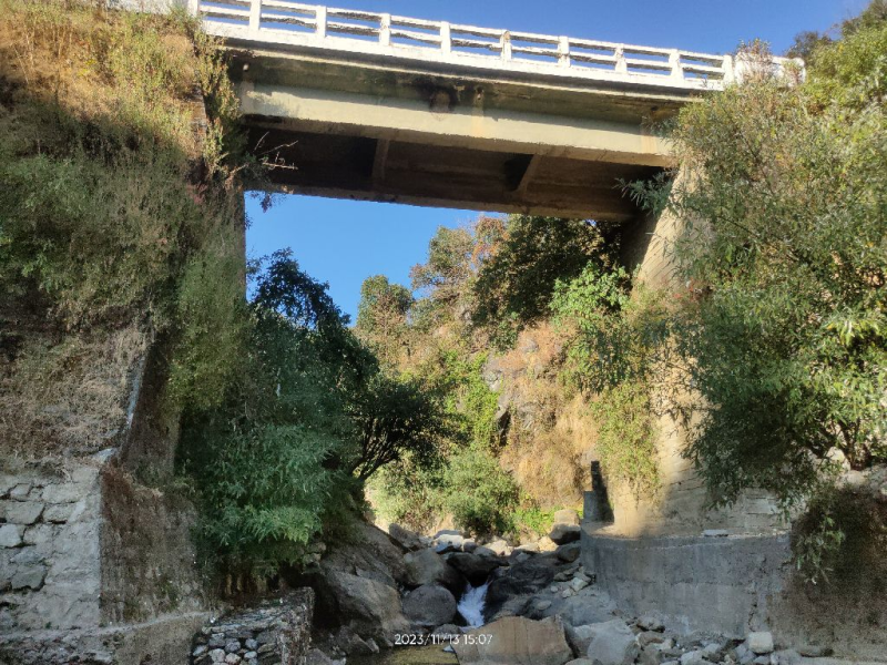 "Safe for traffic. Bed of this bridge was badly damaged due to cloud burst. Abutments has been protected by Plum concrete and wire crates. Bed repair is required as whole bed was washed out. Railing needs repair. Wearing course need repair."