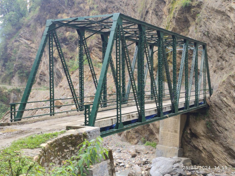"One Bottom Girder (L0L1) at RHS, 4.270 m long comprises of two channel 200X75 back-to-back at clear distance of 270mm is damaged due to rock fall is need to be replaced. Poor drainage near Bridge approachs. Draiange spout are opening to bearing pad at LHS abutment need to close. clearance of bearing area required."