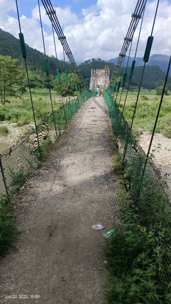 "झूला पुल की बिटुमन उड्डयन गई है। रेलिंग क्षतिग्रस्त है। झाडिया उग गई है। शीघ्र कार्य करना अति आवश्यक है।"