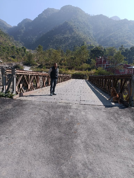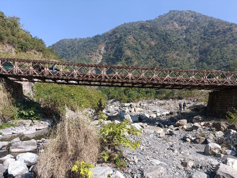 "This Baily bridge is old but installed in 2014 have a bit of corrosion, paint is dull, needs anti corrosive treatment and painting. There are debries deposited in the waterway causing erosion near left abutment, protection works required on upstream and downstream along both banks. "