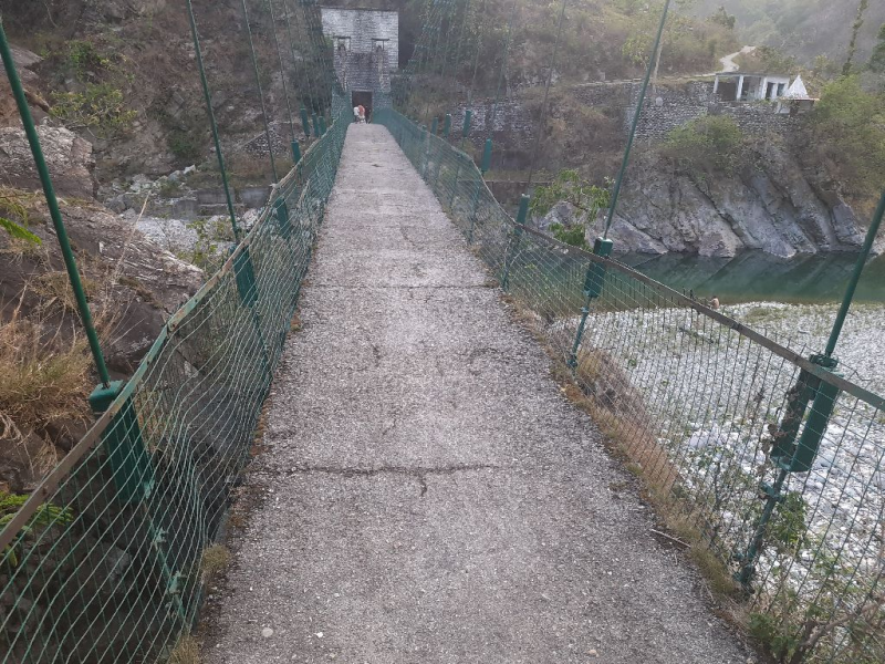 "Right approach road is damaged due to flood.During high flood water flows between anchor block and tower. Protection work of anchor block is required. Construction of approach road is required. River training work to divert water is requird."