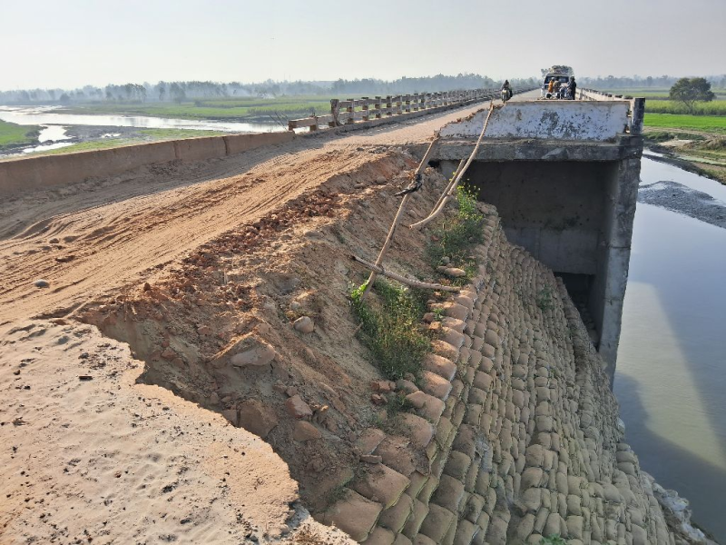 "Bridge structure is intact and left side abutment with approch totally washout and only LVR is passing temporary. The u/s river is meandering and resulting lot of scouring left side of Bridge and approch. The Bridge is unsafe for all type of traffic "