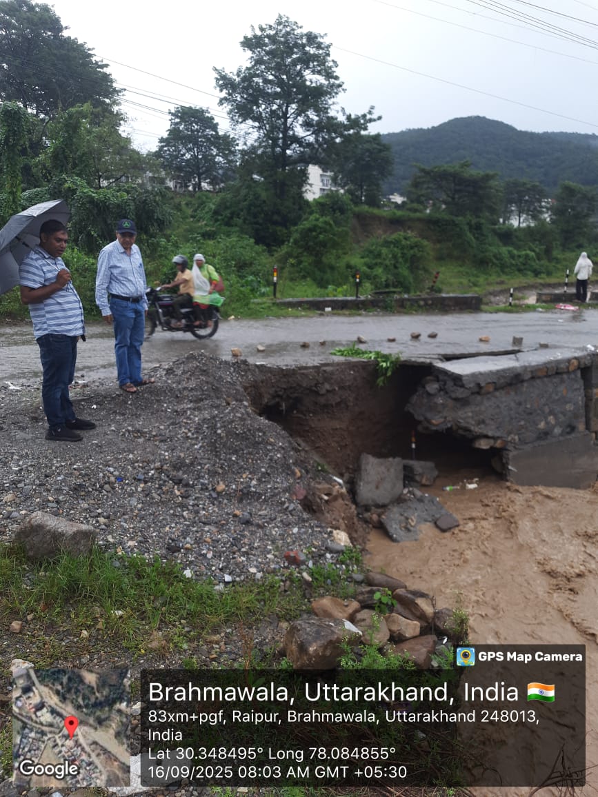 1 2 2025-09-16 07:34:25 2025-09-16 11:34:00 2025-09-16 16:57:12 9 hours 22 mins Opened Harish Chandra ,Draftman ,42008184 1.00 5.00 Sinking मार्ग के काजवे की एप्रोच क्षतिग्रस्‍त हो गयी है। 30.348495000000 78.084855000000 38071