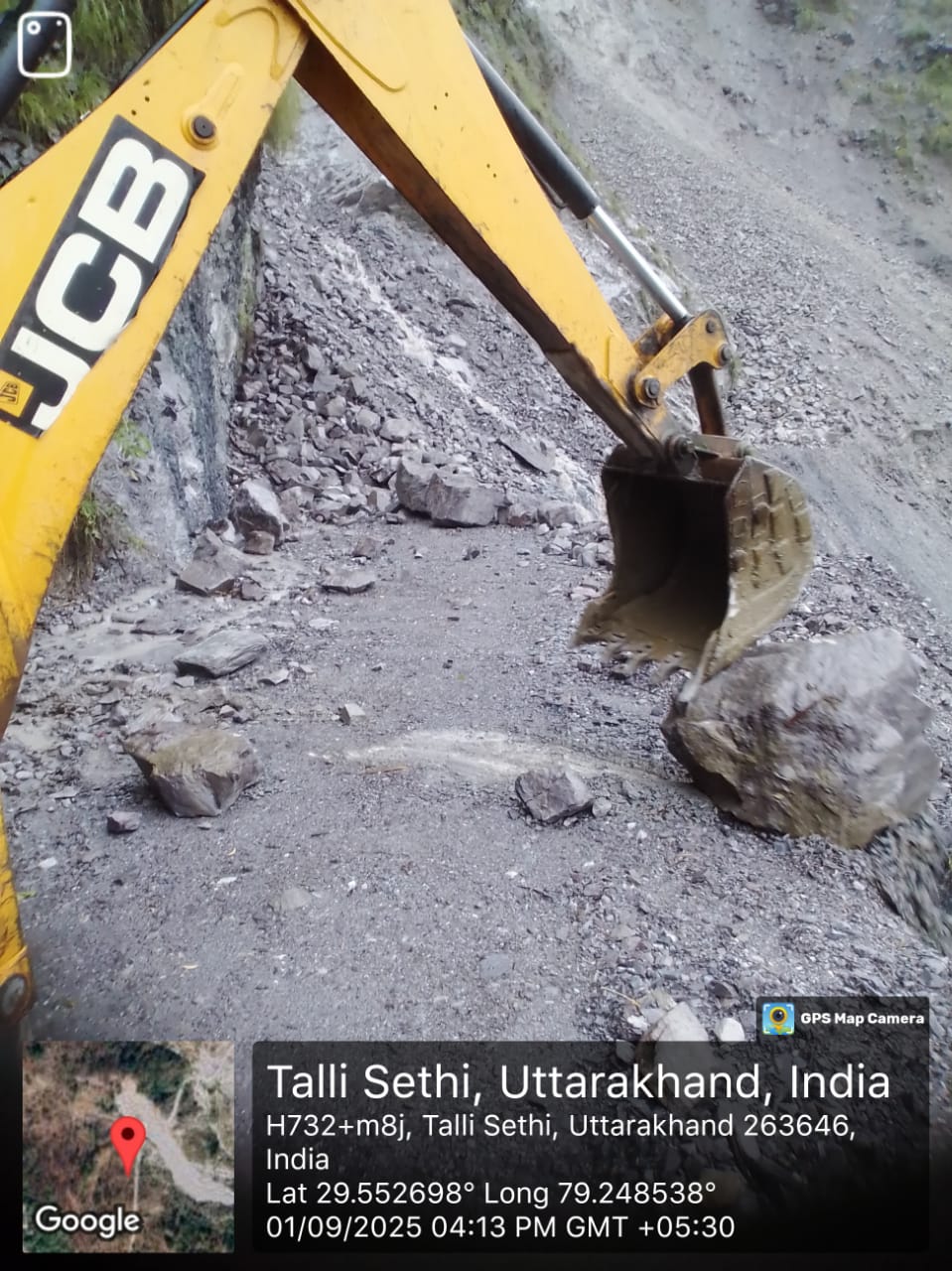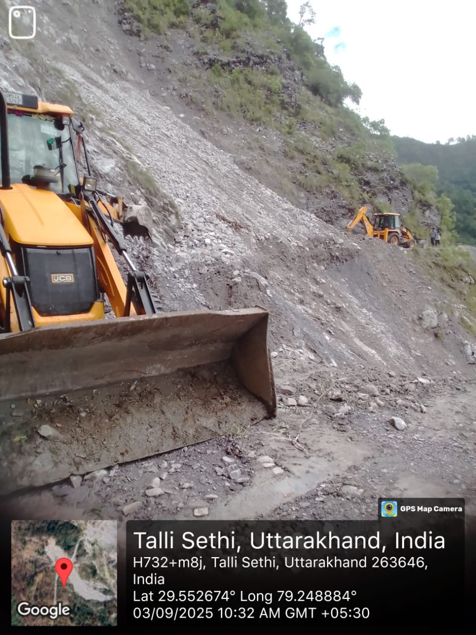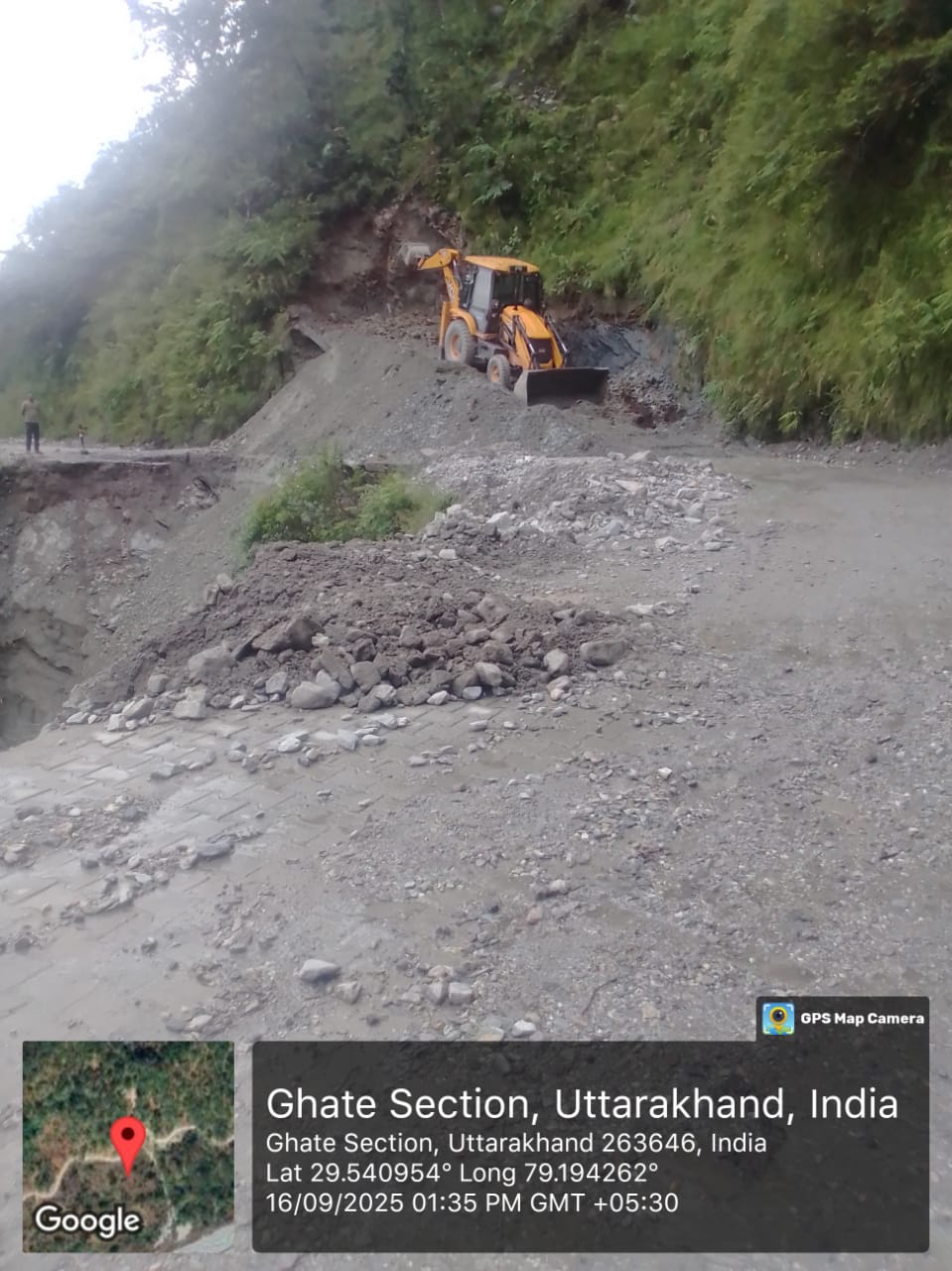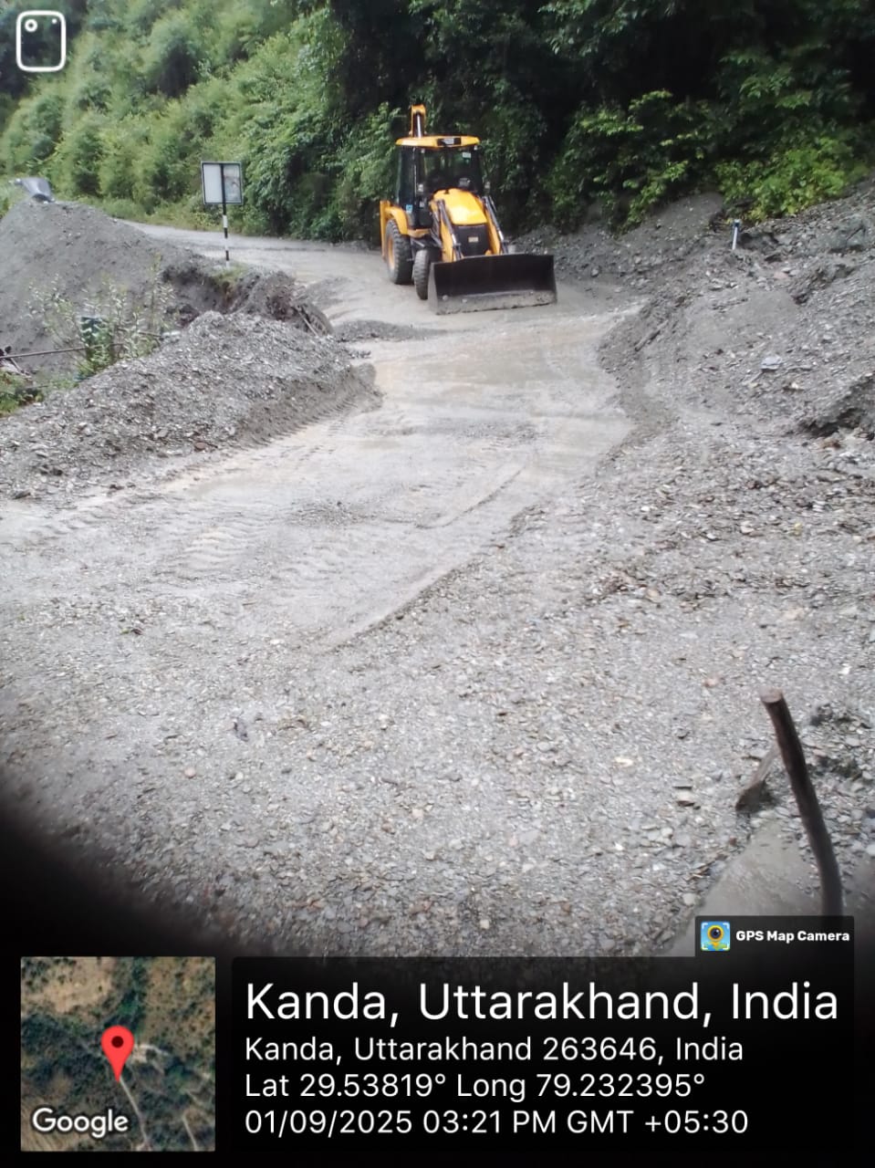 मार्ग किमी 19 में washout हो गई थी जो वर्तमान में केवल हल्के वाहनों हेतु खुला हैं अतिरिक्त पहाड़ कटान एवं मलवा सफाई हेतु दो जेसीबी मशीनें (01 with breaker) कार्यरत हैं।
