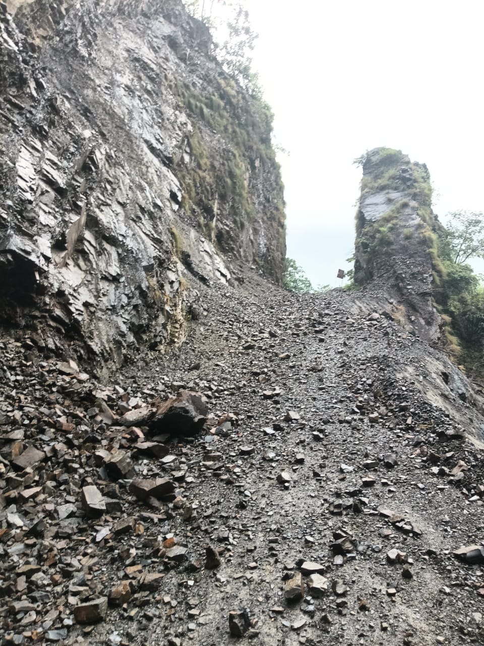 मार्ग पर अस्थाई समाधान हेतु बैक कटिंग की जा रही हैं बारिश होने के कारण कटिंग का कार्य पूर्ण नहीं हो पाया हैं।