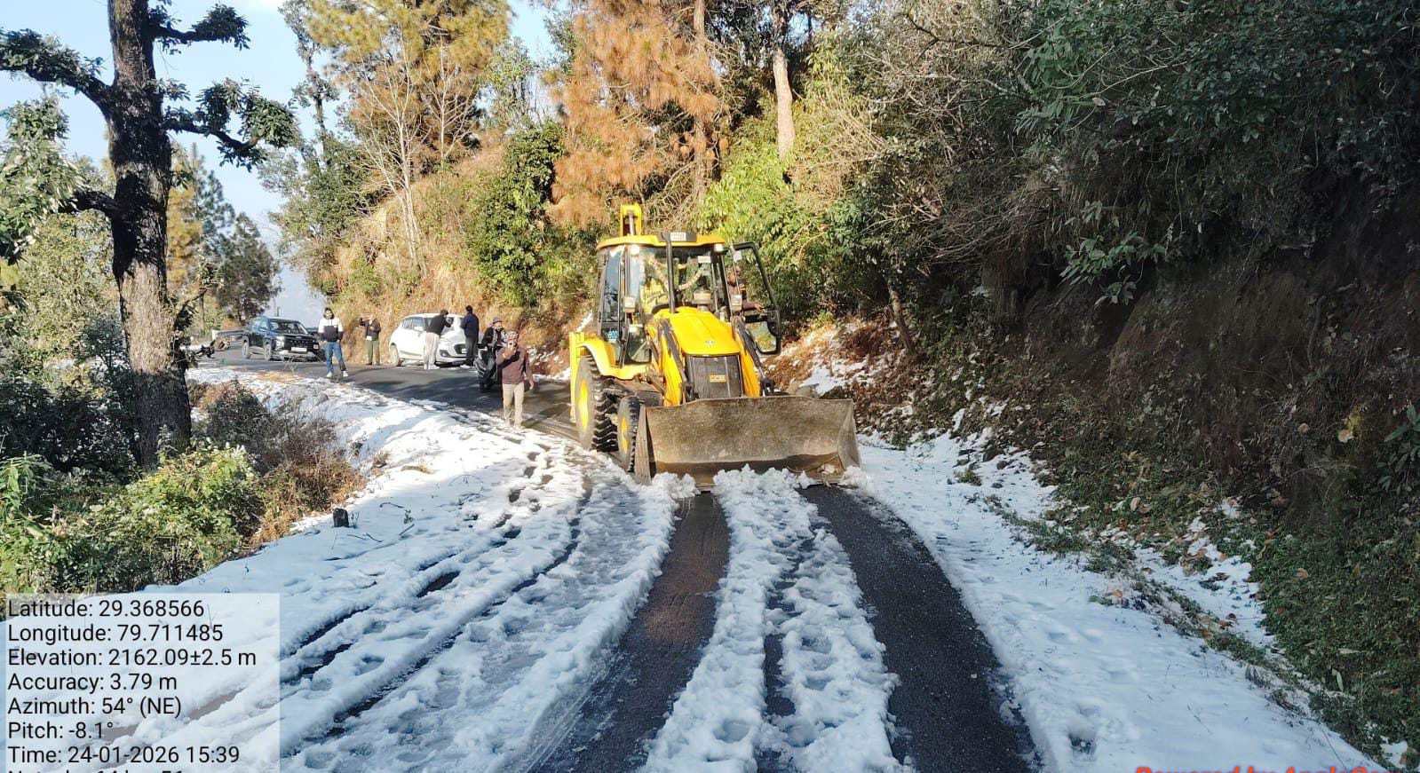 जे0सी0बी0 द्वारा बर्फ हटाकर मार्ग यातायात हेतु खोला जा रहा है। |