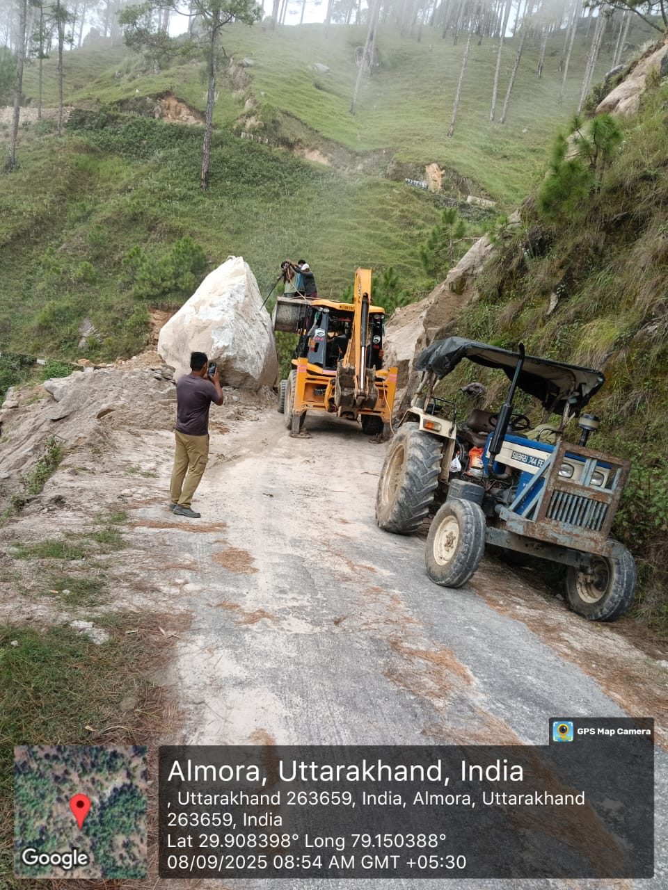 मार्ग पर विशालकाय बोल्डर आ गया है, जो जेसीबी मशीनों द्वारा नहीं हटा, बोल्डर को ब्रेकर द्वारा तोड़ा जा रहा है। मार्ग हल्के वाहनों हेतु खुला है |