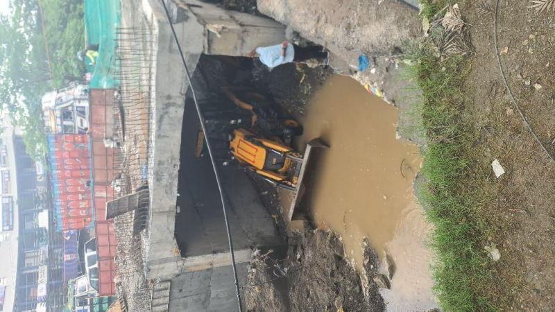 पुलिया निर्माण के दौरान भरे मलवे की निकासी हेतु जेसीबी मशीन नाली सफाई
